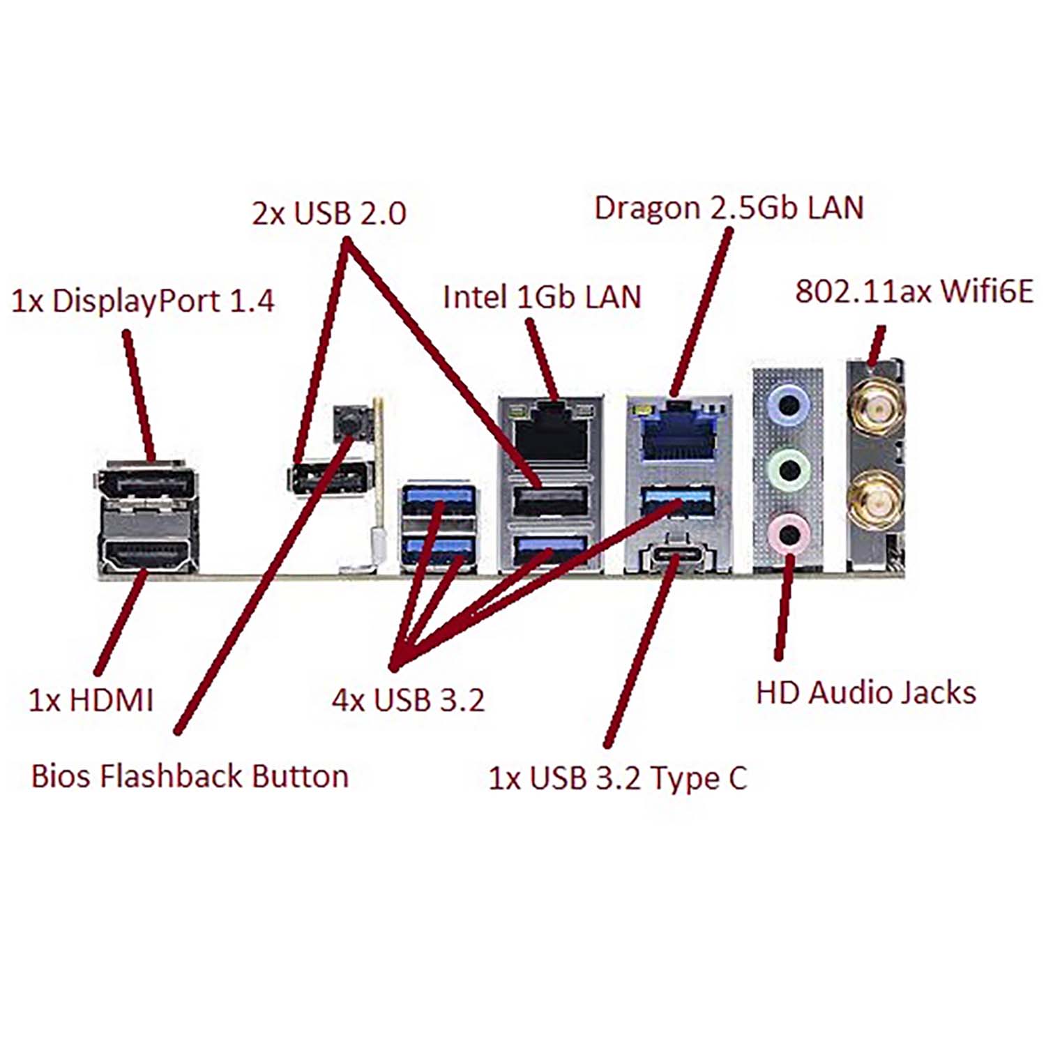 | Rear Panel I/O: | 2 x Antenna Ports 1 x HDMI Port 1 x DisplayPort 1.4 1 x Optical SPDIF Out Port 4 x USB 3.2 Gen2 Type-A Ports (10 Gb/s) 1 x USB 3.2 Gen2x2 Type-C Port (20 Gb/s) 1 x USB 2.0 Port 2 x RJ-45 LAN Ports 1 x Line Out Jack (Gold Audio Jack) 1 x Microphone Input Jack (Gold Audio Jack) |